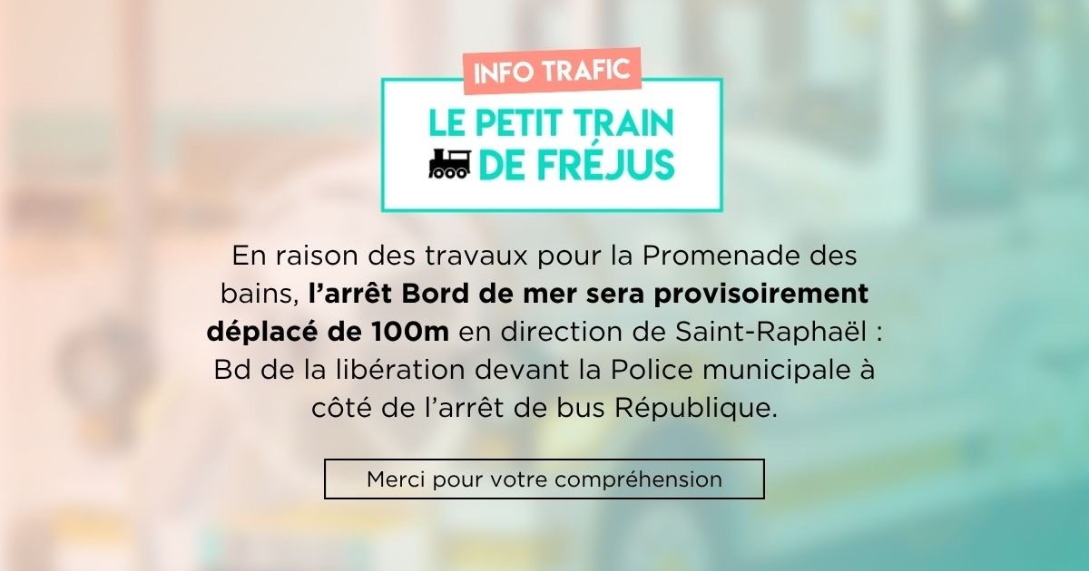 En raison des travaux pour la promenade des bains, l’arrêt Bord de mer sera provisoirement déplacé de 100m en direction de st raphael : bd de la libération devant la Police municipale à côté de l’arrêt de busRépublique.
